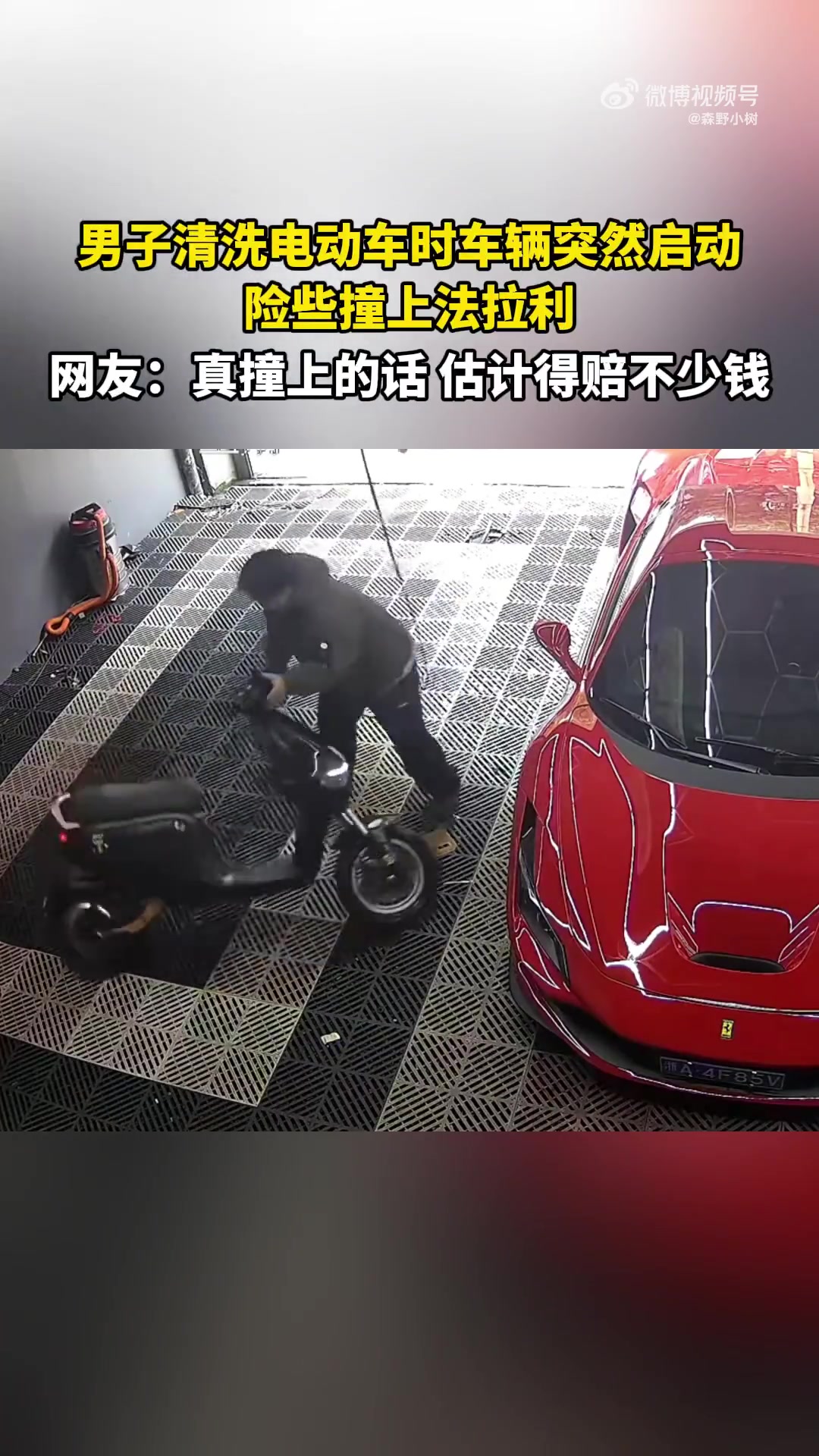男子清洗电动车时车辆突然启动,险些撞上法拉利!!