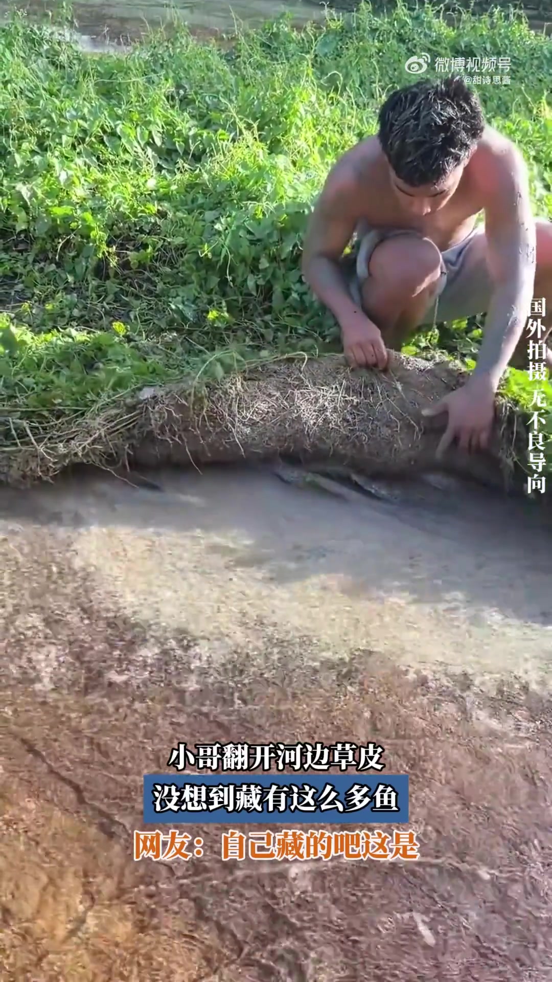小哥翻开河边草皮,没想到藏有这么多鱼!